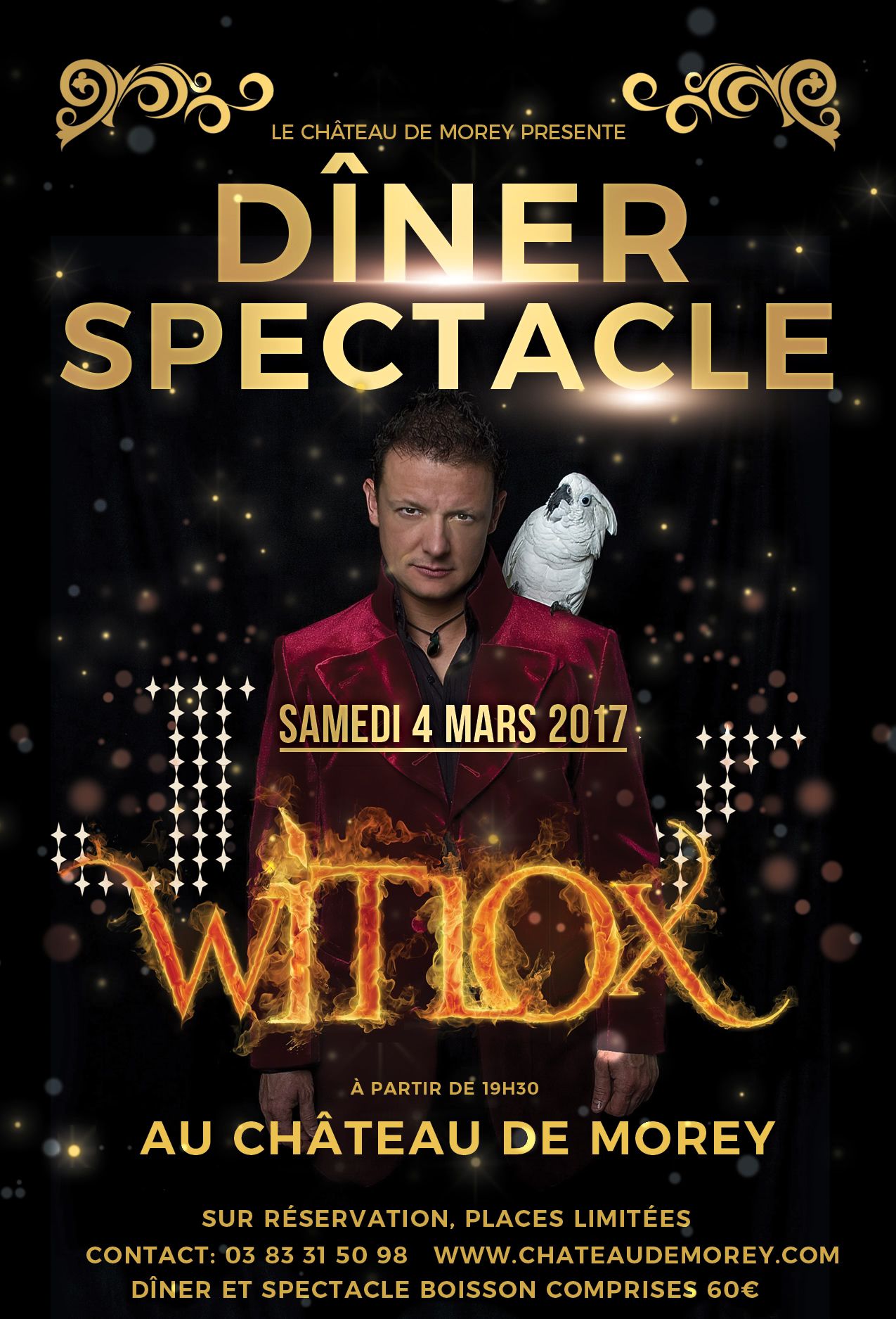 Assister au spectacle de Jay Witlox aux Château de Morey, entre Nancy et Metz. C’est une manière de vivre les mystères des tours de magie. De la plus petite illusion à la plus spectaculaire, Jay Witlox vous fera vivre sa passion. Tout va se passer sous vos yeux, à votre table. Un repas convivial, où vous serez émerveillés. Pour satisfaire votre curiosité, Jay Witlox fera le tour de chaque table et exécutera un tour. En passant par les tours classiques, et si vous aimez les sensations fortes, vous serez agréablement surpris par cet univers mystérieux de la magie.